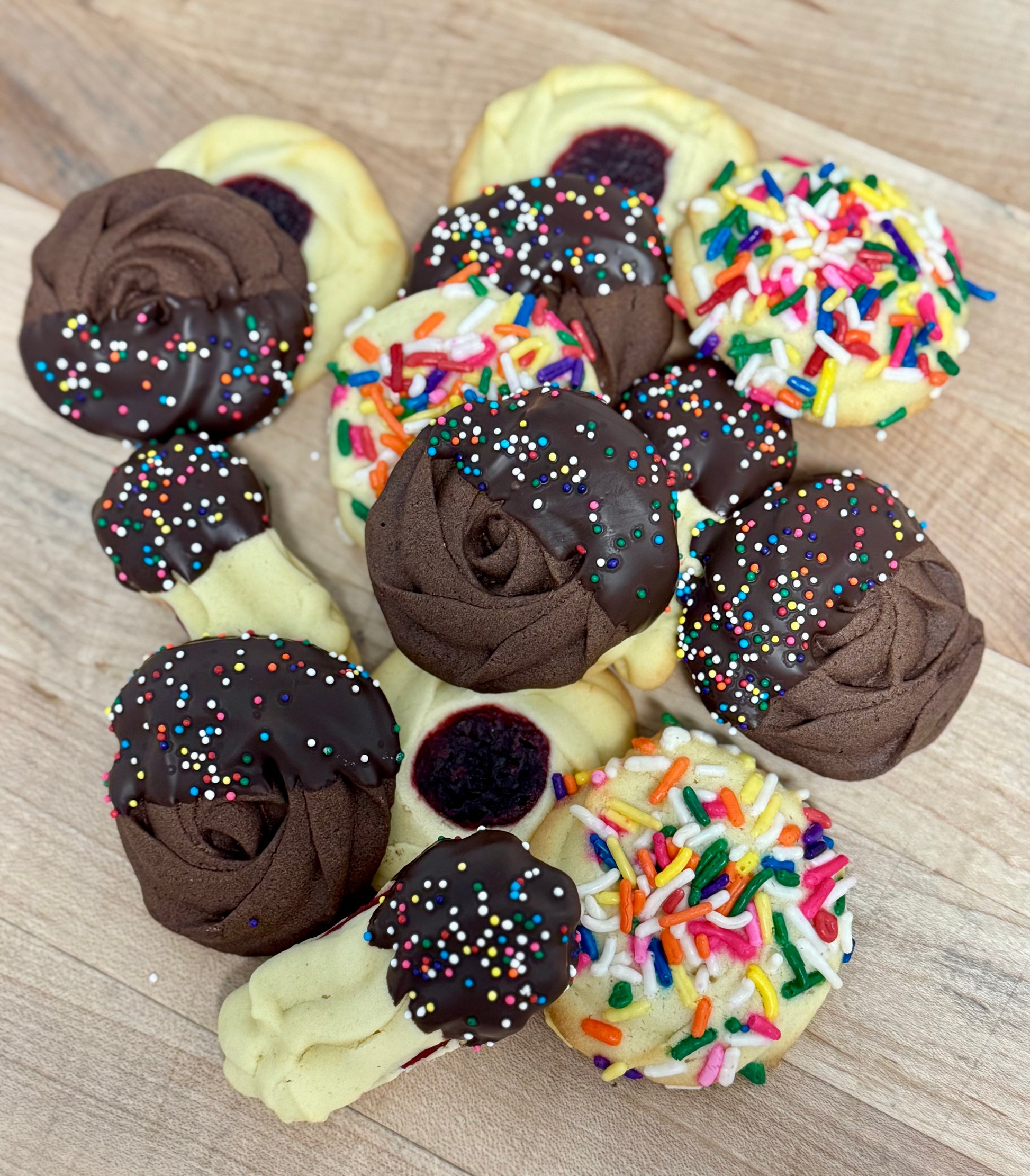 A variety of chocolate, sprinkles, raspberry sandwhich - dipped in chocolate with sprinkles, and raspberry spritz
